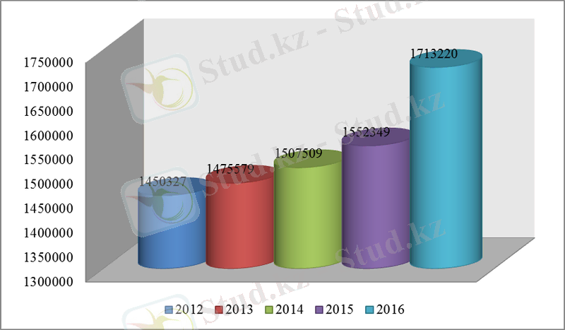 Сонымен 2012-2016 жылдардағы Алматы қаласының халық саны 5 жыл ішінде өзгеріп тұрған. 7-суретте көріп отырғанымыздай, қала халқының саны жылдан-жылға өсіп отыр. Себебі, Алматы қаласында өмір сүру қолайлы болғандықтан қала халқының саны артып келеді [33. 1-2 б. ] .