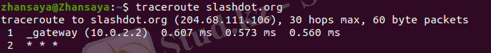 Мұнда сіз біздің тест жүйесі мен арасындағы жолда не бар екенін көре аламыз http://www. slashdot. org / 16 маршрутизатор бар. Идентификациялық ақпаратты ұсынатын маршрутизаторлар үшін хост атаулары, IP мекенжайлары және жергілікті жүйе мен маршрутизатор арасында пакеттерді беру/растау үшін үш уақыт аралығын қамтитын өнімділік туралы ақпарат көрсетіледі. Сәйкестендіру ақпаратын ұсынбайтын маршрутизаторлар үшін (мысалы, маршрутизаторды орнату ерекшеліктеріне, желідегі кептелістерге, брандмауэр әрекеттеріне және т. б. ) . D. ), жұлдыздар екінші ауысуға сәйкес келетін жолда көрсетілгендей көрсетіледі. Кейде маршрутизатор туралы ақпарат бұғатталған кезде, бұл шектеуді Traceroute командасына-T немесе-I параметрін беру арқылы жеңуге болады.