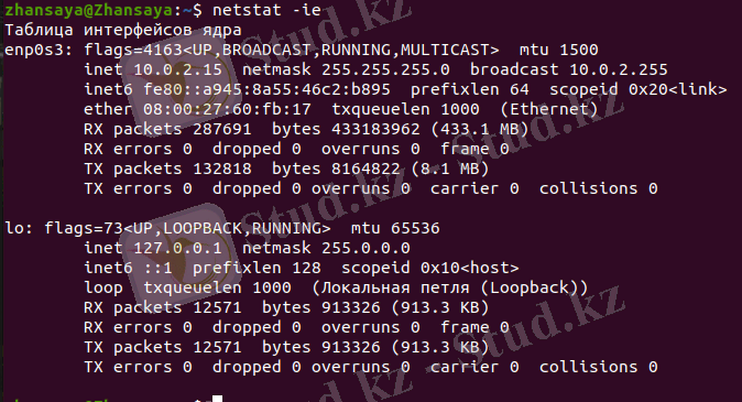 netstatNetstat әртүрлі желілік параметрлер мен статистиканы зерттеу үшін қолданылады. Осы команданың көптеген параметрлерінің көмегімен желіні орнатудың әртүрлі аспектілерін көруге болады. -Ie параметрін қолдана отырып, мысалы, жүйеде желілік интерфейстерді зерттеуге болады.