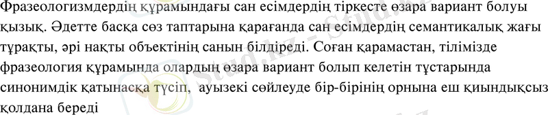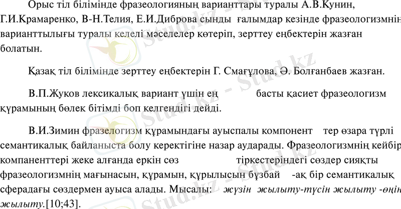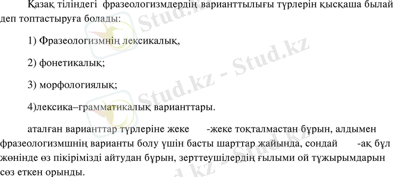 мағынасына, әр компанент семантикасының бірлігіне байланысты. Орыс тіліндегі фразеологизмдердің варианттылығы туралы жоғарыда айтылған ой-пікірлер, негізінен бірін-бірі толықтырып, варианттылыққа қойылатын талаптың деңгейін айқындайды.