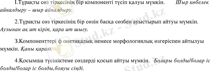 4. Үш немесе төрт компоненттен тұратын, бір тармақты, екі бунақты фразеологизмдердің кейбір компоненттері сөйлеу тілінде түсіріліп айтылады. Мысалдар: қызыл шұнақ сары аяз (сақылдаган сары аяз) -сары аяз-шүнақ аяз; санда бар, санатта жоқ-санда бар немесе санатта жоқ.