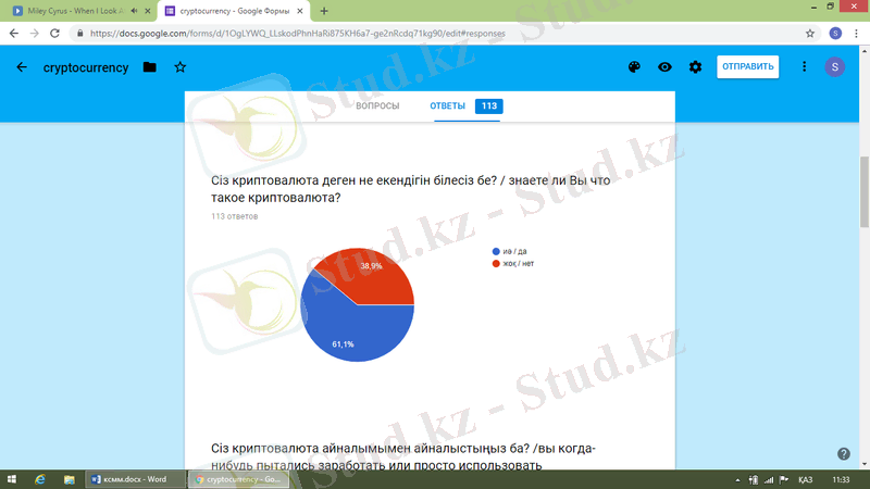 4. Зерттеу жұмысының нәтижелері 4. 1 Сауалнаманың нәтижесіҚазақстандағы криптовалютаның таралуы мәлімет жинау үшін сауалнама жүргізілді. Тұтастай алғанда, сауалнаманы 112 адам өтті.