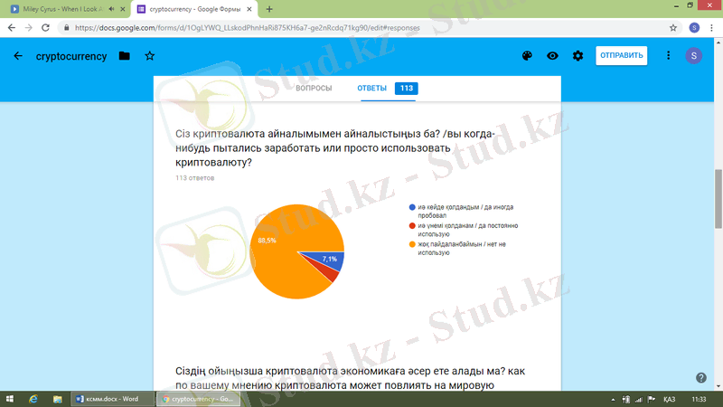 Келесі сұрақ респонденттерден криптовалютаның Казақстандағы жағдайы мен таралуын көруге болды. Қойылған сұраққа келесідегідей нұсқалар таңдауына мүмкіндік берілді: “криптовалютамен кейде қолданам, үнемі қолданам, жоқ пайдаланбаймын ”. Сауалнама алғандардың көбі “жоқ пайдаланбаймын (88, 5%) , кейде қолданам (7, 1%), үнемі қолданам (0, 4%) деген опциялардың жиі таңдап, өзекті проблема ретінде қарастырды.