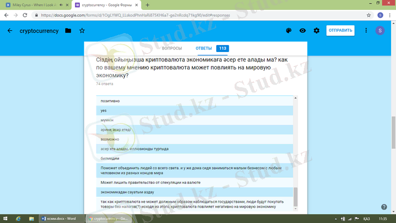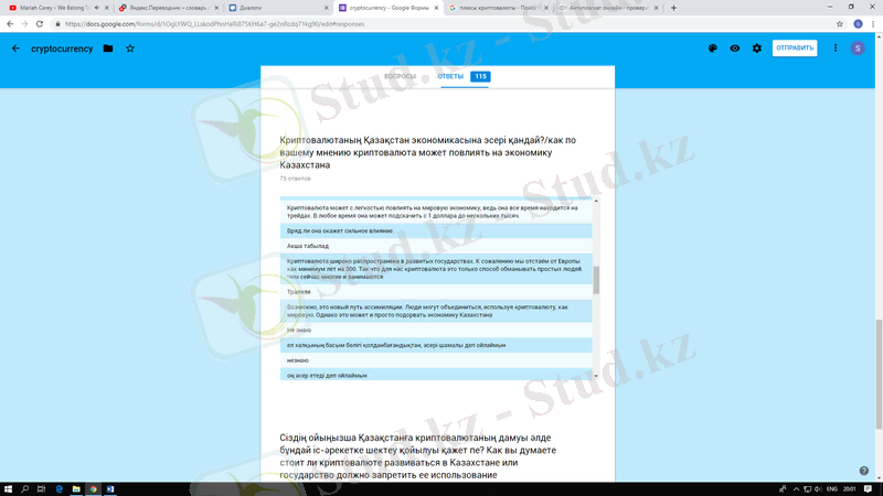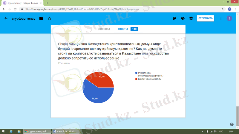 Сонғы сұрақ криптовалютаның келешегі мен оған деген көзқарасы туралы білу мақсатында қойылды. Бұл сұраққа 97 жауап болды. Олардың ішінде 59, 8% криптовалютаның қолданалуына рұқсат беру, ал 40, 2% криптавалютаның шектелуіне дауыс берді.