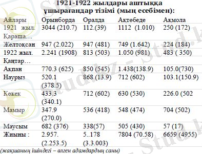 Республиканың Денсаулық сақтау халық комиссариатының деректері бойынша Орынбор, Орал, Ақмола және Ақтөбе губернияларында 1921 жылдың 1 қарашасы мен 1922 жылдың 1 шілдесі арасында 37 657 адам ашаршылы қ құрбаны болды.