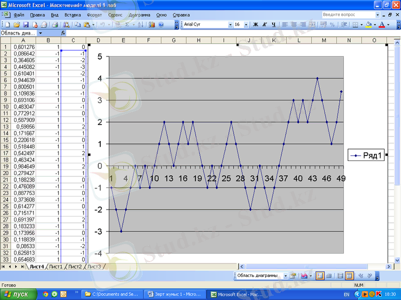 Модельді орындауға электрондық кестені қолданыңыздар. Болсын, бастапқы кезеңде бақылау объектісі y - координатасы y 0 тең нүктеде болады. Егер кездейсоқ сан 0, 5 тен үлкен болса, онда y - координатасына 1 үлкейеді, болмаған жағдайда - 1 азаяды.