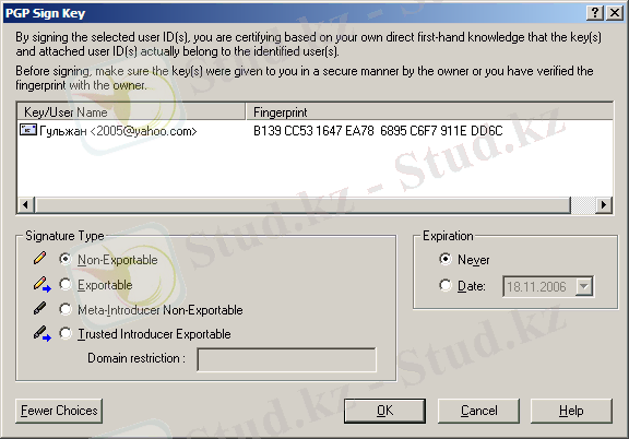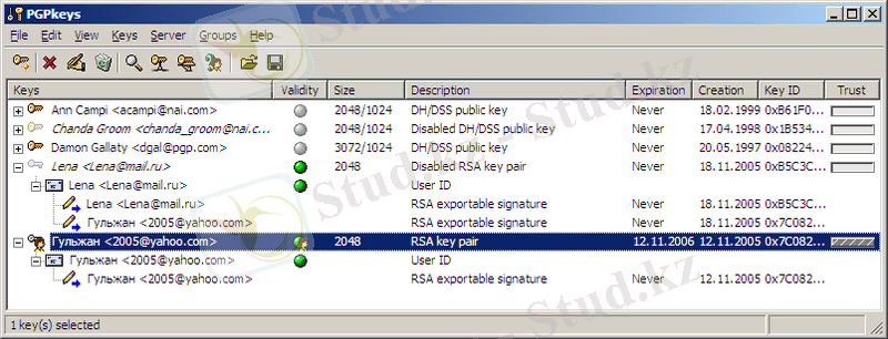 кілтке немесе осы кілтке қолтаңба қойған қолданушыға толық сенімділікті білдіреді. Сенімділік деңгейі кілттердің қасиеттер терезесінде (Keys│Properties) опцияларында Trust Model.