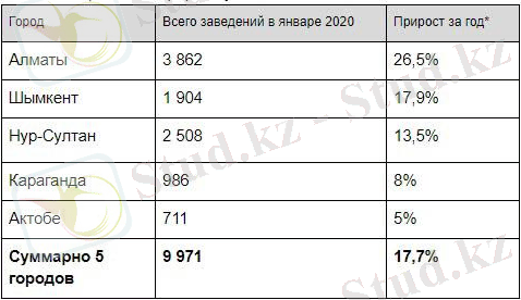 Елордамыздың динамикасы бойынша көшбасшы тамақтану орны суши-барлар форматы. Сауда орындары 74, 1%-ға өсті және 47 мекемеге дейін көтерілді. 518 сауда нүктесінде 38, 5%-ға барлар мен шағын кофеханалар 36, 4% -ға өсу қарқыны екі есе баяу болды. Қарапайым динамиканы фаст-фуд сияқты демократиялық сегменттер көрсетіп, 426 сауда нүктесінде 2, 7%-ға өсті. Суретте қоғамдық тамақтандыру кәсіпорындары санының өсуі бойынша қалалардың рейтингі берілген.