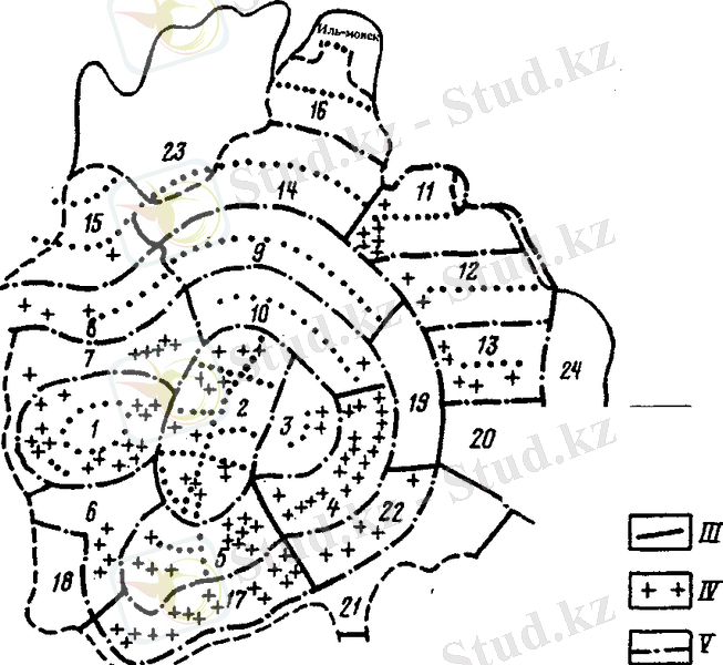 I - Д1 көкжиегі шоғырының контуры; II - кесу сызықтары; III, V-алаңдардың шекаралары; IV-алаңдардағы су басу ошақтары.