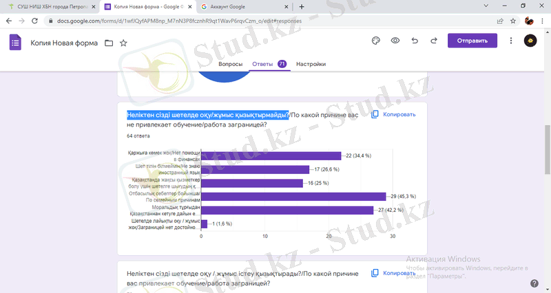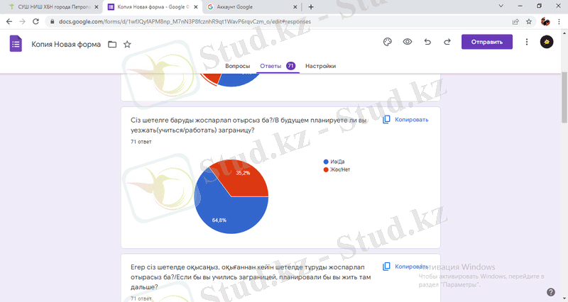 Сауалнамаға жауапберушілердің 64, 8% шетелде оқуды немесе жұмыс жасауды жоспарлайды, ал 35, 2% өз туған жерде қалуды таңдайды (1-диаграмма) .
