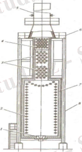 1-сурет. ГС типті құбырлы пештің құрылысы: 1 - форсунка (отын ретінде газ немесе мазут пайдаланылады) ; 2 - радиантты құбырлар; 3 - конвекциялық құбырлар; 4 - ауа жылытқыш; 5 - түтін құбыры; 6 - саты; 7 - футеровка; 8-аппараттың қаңқасы.