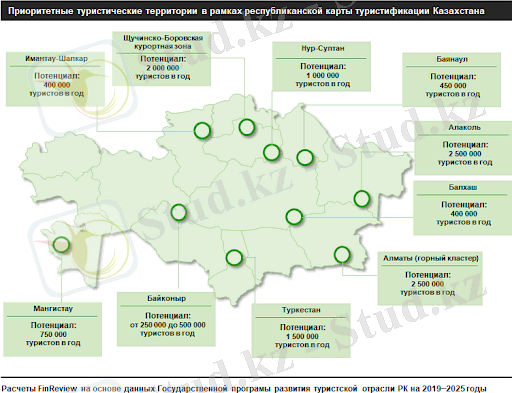 НЕГІЗГІ БӨЛІМ 1. 1 Қазіргі заманда туризмның дамуы қалай жүріп жатыр?Соңғы жылдары Қазақстандағы ішкі туризм әуе қатынасының кеңеюіне және шетелдіктердің келуіне байланысты дамып келеді. Бізде әдемі, бай табиғат, көптеген таулар, көлдер, батыста Каспий теңізі және басқа да көптеген назар аударатын нысандар бар. Дегенмен, мемлекеттің басты мақсаты - отандық туристер санын арттыру. Біздің елдегі азаматтардың көпшілігі әрқашан шетелде демалуды жөн көрді, бірақ пандемия адамдарды елде демалуға мәжбүр етті. Сондықтан 2019-2020 жылдардағы жаһандық дағдарысқа қарамастан, Қазақстан мүмкіндігінше үлкен шығынға ұшыраған жоқ. Мұның бәрі жергілікті халықтың Қазақстанды көп аралап, саланы сақтауға үлкен үлес қосқанының арқасында. Диаграма бойынша, Қазақстанның ең танымал аймақтарға Алматы қаласы, Алакөл және Түркестан қаласы жатады.