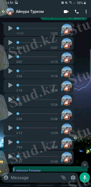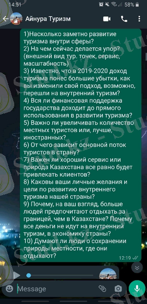 Біріншіден, мен Атантаева Айнура Алмасовна, «Sanutour» туристік агенттігінің иесімен сұхбат жүргіздім. Ол арқасында мен қандай туризмді дамыту қажет (сыртқы әлде ішкі), туристердің негізгі ағыны қандай факторлар анықтайды және саланың қазіргі даму деңгейінің себептерін білдім. Айнур айтуынша, ішкі туризмнің көлемін ұлғайту, ел экономикасына үлес қосу, азаматтардың тұрмыс жағдайын жақсарту маңыздырақ. Дегенмен, басқа елдерден келушілер санын арттырудың әлеуеті зор және бұл мақсатқа жетуде үкімет басты рөл атқармауы мүмкін. Сонымен қатар, азаматтар мен туристердің толық қауіпсіздігін және саяхаттаудың ыңғайлылығын қамтамасыз ететін дайын турпакеттерді жасау саланы дамытудағы жақсы қадам болмақ.