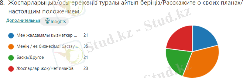 Жоспарлар немесе қазіргі жағдай туралы сұрайтын келесі сұрақта 35 пайызы өз бизнестерін қалайтыны немесе иеленетіні белгілі болды. Адамдардың бір бөлігі жалдамалы жұмысшы болғысы немесе басқа бір нәрсе жасағысы келетінін, әр нұсқа үшін 21 пайызды атап өтті. Жауап бергендердің қалған 23 пайызы әлі жоспарлары жоқ