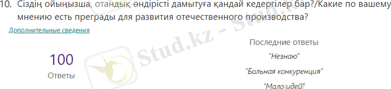 Келесі сұрақта респонденттерге отандық өндірісті дамытуға кедергілерді атау ұсынылды, онда адамдардың пікірлері бірнеше топқа бөлінді. Жауап берушілердің едәуір бөлігі шетелдік импортталатын тауарлар жергілікті тауарлардың дамуына кедергі келтіреді деп санайды, өйткені олар үшін бәсекелестік туғызады. Әлеуметтік себептер туралы айтатын болсақ, қоғам жергілікті өндіріске сенбейді, ал өндіргісі келетін адамдар анық емес немесе идеялары жеткіліксіз. Алайда, бастапқы капиталды алу отандық өндірістің қалыптасуына, несие жүйесіне және электр энергиясының жоғары бағасына кедергі болатындығын ұсынатын қаржылық бөлімге қатысты жауаптар болды.