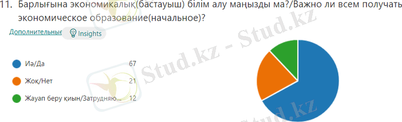 Келесі сұрақта 67 адам үшін экономика саласында білім алу маңызды екені анықталды, ал қалған адамдар үшін бұл маңызды емес(21) немесе жауап беру қиынға соғады(12)