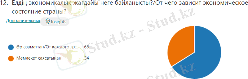 Респонденттердің соңғы сұрағында мемлекет экономикасының дамуы неге байланысты екенін атап өтуді сұрады, бұл 66% - ы бұл елдің әрбір азаматына байланысты екенін және 34-і үшін мемлекет жауап беретінін көрсетті.