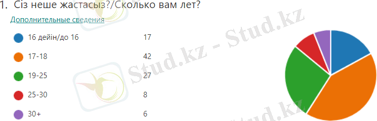 2. 4. Зерттеу нәтижелері. 2. 4. 1. СауалнамаҚазақстан экономикасына әсер ететін факторларды анықтау мақсатында зерттеудің екінші және алғашқы әдістері қолданылды. Зерттеудің екінші әдістері БАҚ ресурстарын талдауды, мемлекеттік сайттардан алынған ақпаратты талдауды, сондай-ақ экономика саласындағы сарапшылардың мақалалары мен еңбектерін зерделеуді қамтиды. Бастапқы әдістерге сауалнама мен сұхбат кіреді. Осы әдістерді қолдана отырып, сапалы және сандық мәліметтер алуға болады. Қайталама зерттеу үшін өзекті және бірегей контентін бар интернет ресурстардан алынған материалдар пайдаланылды. Сондай-ақ, ресурстардың түпнұсқалығы RAVEN стратегиясы бойынша мұқият тексерілді. Пайдаланылған дереккөздердің толық тізімі "Пайдаланылған әдебиет" бөлімінде берілген. Сауалнамадан 16-дан 30-ға дейін және одан да көп жас санатындағы 100 адам өтті. Респонденттердің 17% - ы 16, 42% - ы 17-18 жаста, 27% - ы 19-дан 25-ке дейін, 8% - ы 25-тен 35-ке дейін, 6% - ы 30 жастан асқан. Орташа есеппен сауалнама 2 минут 24 секунд ішінде жүргізілді.
