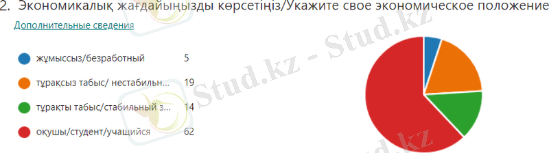 Екінші сұрақта респонденттердің экономикалық жағдайы туралы сұралды, олардың 62% - ы студенттер мен студенттер, 19% - ы тұрақсыз, ал 14% - ы тұрақты табыс және жұмыссыз адамдардың 5% - ы.
