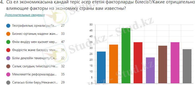 Төртінші сұрақта респонденттерден Қазақстан экономикасының дамуына теріс әсер ететін факторларды таңдауды сұрады, мұнда өнімдер өндірісі мен қызмет көрсетудің өзіндік құны жоғары, ал білім деңгейінің төмендеуі ең елеусіз себеп болып табылады. Сондай-ақ, ең маңызды себептердің бірі өндірістік және басқарушылық технологиялардың жаңару жылдамдығы, бизнес саласындағы мәдени және моральдық принциптердің болмауы, географиялық орналасуы, сапасыз білім, салық салудың және мемлекеттік реформалардың тиімсіздігі болды.