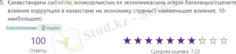 Келесі сұрақ Қазақстандағы сыбайлас жемқорлықтың ел экономикасына әсерін бағалауға бағытталған болатын, оның орташа нәтижесі 10 баллдың 7. 22-ін құрайтынын көрсетті.