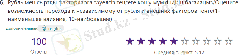 Алтыншы сұрақ, сондай-ақ бағалауда болды, онда жауап берушілер рубль мен сыртқы факторлардан тәуелсіз теңгеге 10-нан 5, 12 баллға көшу мүмкіндігін бағалады.
