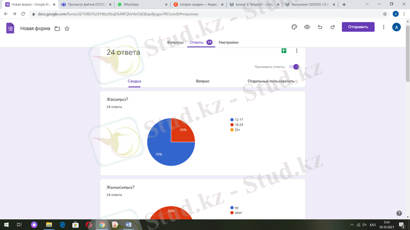 1-сұрақ. Бұл сұрақ сауалнамаға қатысқан адамдардың жас ерекшеліктері бойынша қай диапазонға тиесілі екенін анықтайды. Респонденттердің 75%-ы әлі кәмелеттік жасқа толмаған жасөспірімдер екен. Яғни, 18 адам 12 мен 17 жас аралығында. Ал қалған 25%-ы 18 бен 24 арасындағы жаста. Өкінішке орай, сауалнамаға 25 жастан үлкен қатысушылар жоқ.