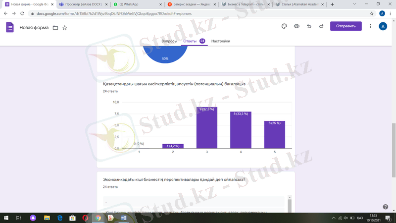 5-сұрақ. Қазақстандағы шағын кәсіпкерліктің әлеуетін (потенциалын) бағалаңыз. Бұл сұраққа респондент шағын бизнестің қазіргі кездегі жұмыс жағдайын ескеріп, оның келешекте дамуына ықпал ететін әлеуетін 5 баллдық шакаламен бағалау қажет. 1 деген өте төмен дегенді білдірсе, 5 деген өте жоғары дегенді білдіреді. Сәйкесінше, 3 деп жауап бергендер орташа бағалайды, ал 2 орташадан төмен, 4 орташадан жоғары бағалауды білдіреді. Астындағы диаграммаға назар аударсақ, орташа бағалайтын респонденттердің саны жоғары екенін байқаймыз. Олардың пайыздық өлшемі 37, 5%- құрайды. Орташадан төмен деп жауап берген адамдар саны біреу, бұл 24 адамның 4, 2%-ы дегенді білдіреді. 8 адам орташадан жоғары деп жауап берсе, 6 адам өте жоғары деген баға береді. Яғни, пайызбен 33, 3% және 25% екені анықталды.