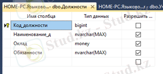 Деректер қорын жобалау мәліметтер базасының құрылымын құрудан басталады. Әр кестеде кілт өрісі бар. Кестелер арасындағы байланыс «бірден-көпке » байланысымен байланысқан. 2-суретте Должности кестесінің құрылымы көрсетілген.