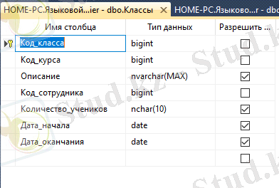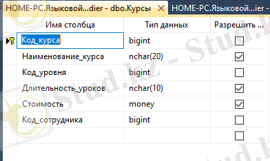 "Курсы" кестесінде барлық курста үйретілетін тілдер туралы ақпаратты сақтауға арналған. 3-суретте оның құрылымы көрсетілген.