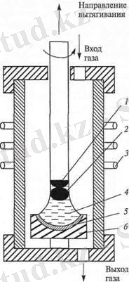 4 суретте : 1 - ұйытқыш материал, 2- өсетін монокристалл, 3- жоғарғыжиілікті редуктор, 4- балқыма, 5- кварцтен жасалған ампула, 6- графиттен жасалған сыртқы қаб