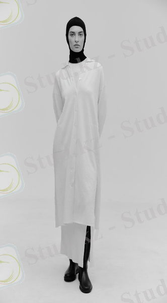 Алдыңғы бөлігі тұтас пішілген, бүкіл ұзындық бойына етегі кеңейтілген, және жан қалтамен өңделген.