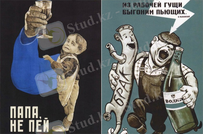алкогольді тұтынуға қарсы насихаттың журнал-газет жанрына айналған плакаттар мен карикатуралар бар.