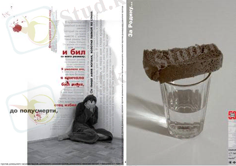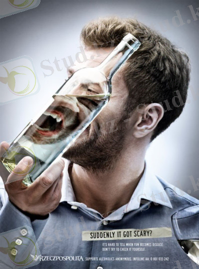 Алкоголизм тақырыбы өте күрделі және нәзік, өйткені плакаттағы бөтелкенің кез-келген бейнесі шарапқа тәуелді адамда тек тұтынуға деген ынтаны тудырады. Осыған сәйкес, плакатты жасаушылар маскүнемділік өлім қаупін еске түсіретін үлкен шрифтпен жазылған ұрандарды бірінші орынға қояды. Бұл жағдайда тақырыптың бейнелі, метафоралық шешімі орынды, ал кейбір түзу мәселені одан сайын ушықтыруы мүмкін.