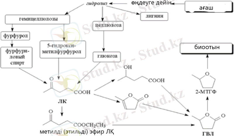 Бүгінгі күні ЛҚ негізіндегі биоотын өндіру процесі үЛҚен қызығушылық тудырады. ЛҚ гамма-валеролактон (ГВЛ) синтезінде прекурсор ретінде қызмет ете алады [1] . Сонымен қатар, ЛҚ отын қоспасы 2- (2-МТГФ) айналуы мүмкін. 2-MТГФ іштен жанатын қозғалтқыштарға зиян келтірместен бензинмен 70% дейін араластыруға болады және әлі де осындай жүгіріске қол жеткізуге болады. ЛҚ-ны 2-МТГФ-ге тікелей түрлендіру мүмкіндігі бар, алайда жақсартылған өнім шығымдылығына аралық өнім ретінде ГВЛ өндірісі арқылы өтетін жанама жолдар арқылы қол жеткізуге болады [2] .