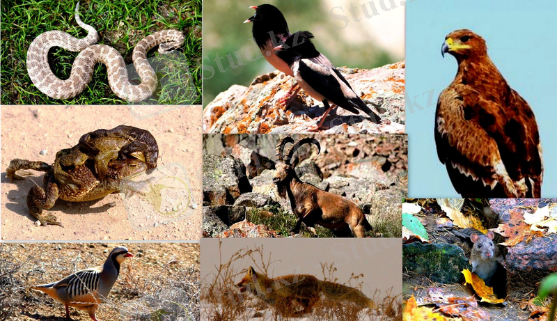 Қазақстан территориясында ландшафттық кешендердің бірегей жиынтығы бар: шөлдерден биік таулы аймақтардан бастап және ішкі теңіздердің экожүйелеріне дейін. Құрғақ және ылғалдан төмен жерлер Қазақстан Республикасы аумағының 75%-дан астамын алып жатыр. Олардың құрамында 40% астам барлық биологиялық әртүрліліктің түр құрамы. Қазақстанның фаунасы қатаң қорғалатын және қорғалатын әртүрлі түрлермен ұсынылған коммерциялық мақсатта кеңінен қолданылады. Мұнда 835 түрі мекендейді омыртқалылар, оның ішінде сүтқоректілер - 178, құстар - 489 (оның ішінде 396 ұя салатын), бауырымен жорғалаушылар - 49, қосмекенділер - 12, балықтар - 104 және циклостомдар - 3 түр. Аңшылық объектілері сүтқоректілердің 34 түрі және құстардың 59 түрі.