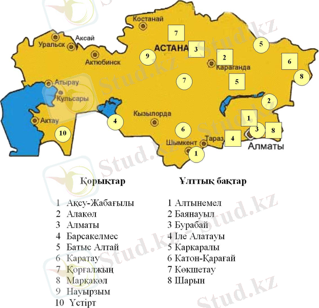Сурет-3. Қазақстанның қорықтар мен ұлттық бақтарының тізімі және картасы.