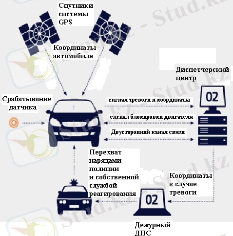 1. 2-суретте автомобильге арналған спутниктік күзет сигнализациясы жүйелерінің жұмыс схемасы көрсетілген.