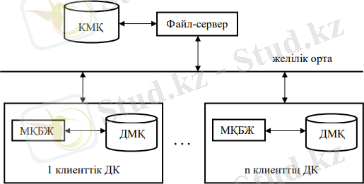 Клиент-сервер архитектурасында оны жүзеге асырудың түрлі нұсқаларына жол беріледі. Тарихи тұрғыдан алғашқы болып файл-серверін қолданумен үлестірілген АЖ-лар пайда болды (2. 1-сурет) . Мұндай АЖ-ларда пайдаланушылардың сұраныстары бойынша мәліметтер қорының файлдары дербес компьютерлерге (ДК) беріледі, ол жерде олар өңдеуден өткізіледі. Архитектураның бұл нұсқасының кемшілігі өңдеуден өткізілетін мәліметтерді берудің жоғары қарқындылығы. Оның үстіне көбінесе артық мәліметтер беріледі: пайдаланушыға мәліметтер қорындағы жазбалардың қаншасы қажет екендігіне тәуелсіз мәліметтер қорының файлдары тұтастай беріледі.