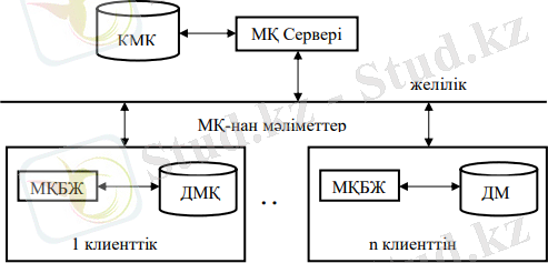 МҚ-мен жұмыс істейтін үлестірілген АЖ-ларды құрған кезде клиент-сервер архитектурасы кең түрде қолданылады. Оның негізін МҚ-ны басқару кезінде клиент мен Пайдаланушы Қосымша МҚБЖ МҚ сервердің өзара әрекеттесуін ұйымдастыру ұстанымдары құрайды. Клиент-сервер архитектурасының бір нұсқасы 1. 2-ішкі тармағында қарастырылған. МҚ-ны басқару процестерінің өзара әрекеттесуінің негізгі сұлбаларына сипаттама беру үшін OSI ашық жүйелер архитектурасының Эталондық моделін пайдаланайық. Бұл модельге сәйкес МҚ-ны басқару қызметі қолданбалы деңгейге жатады.
