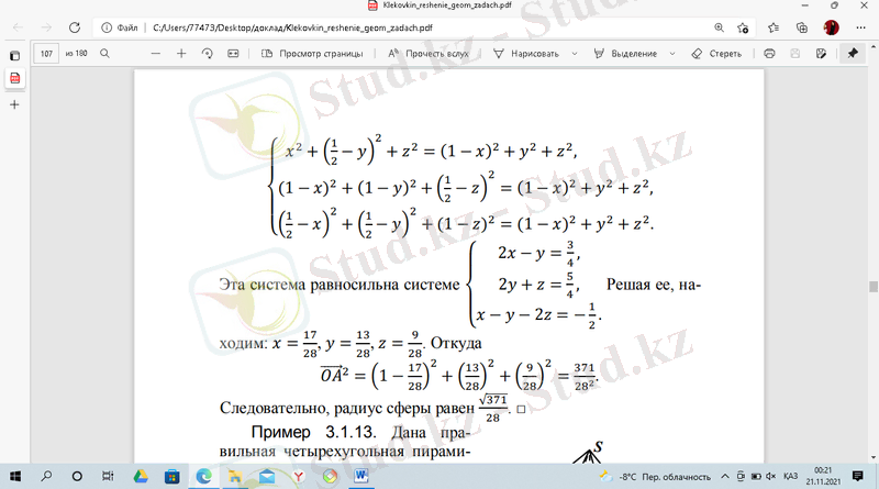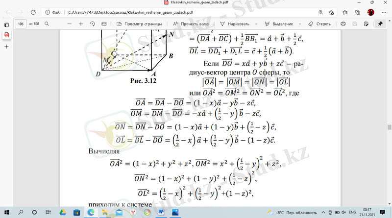 4. 3. 1. 12. Қабырғасы 1-ге тең 𝐴𝐵𝐶𝐷𝐴 1 𝐵 1 𝐶 1 𝐷 1 кубы берілген. 𝐴 төбесі, 𝐴 1 𝐵 1 𝐶 1 𝐷 1 жағының ортасы және 𝐶𝐷 мен 𝐵𝐵 1 бүйірлерінің ортасы арқылы өтетін сфераның радиусын табыңыз.