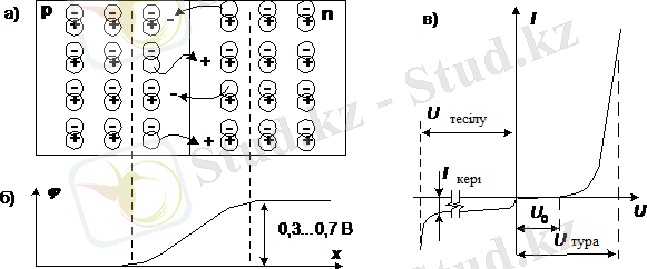 Екі электродты шала өткізгіш элемент - диод n және р өткізгіш қабаттарынан тұрады (1. 1 сурет) . n өткізгіш қабатында еркін зарядты тасымалдауыш ретінде электрондар көп болады, ал р өткізгіш қабатында - кемтіктер (дырки) болады. n -аумағынан р -аумағына электрондардың диффузиясы және керісінше, р -аумағынан n -аумағына кемтіктердің диффузиясы нәтижесінде шекарада потенциалды бөгеу (тосқауыл) пайда болады (1. 1 а, в сурет) .