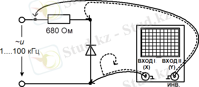 1. 3. 5 Айнымалы тоқтағы диодтардың сипаттамаларын зерттеу үшін 1. 5 суреттегі принципті сұлбаға сәйкес жинау алаңында тізбек құрыңыз. Қосымша паразитті сыйымдылықты болдыртпау үшін сұлбаға өлшеуіш аспаптарын қоспаңыз. Сәуленің жоғары қарай ауытқуы диод арқылы өтетін тура тоққа сай келуі үшін ІІ арна бойынша сигналды терістеуді қосуды ұмытпаңыз.