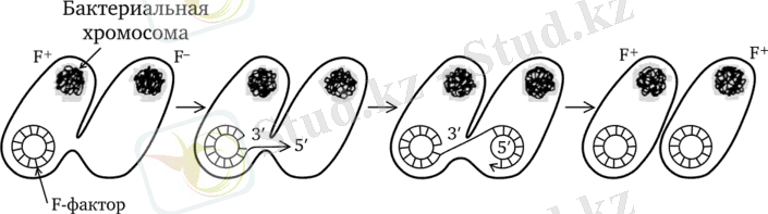 F-фактор құрамында F+ жасушаларының бетінде түтік тәрізді құрылымдардың пайда болуын анықтайтын гендер бар. F-аралар тиісті F-жасуша рецепторларымен байланысады, нәтижесінде F+ және F - жасушалар арасында цитоплазмалық көпір пайда болады. F + жасушасы ұрықтандырушы рөл атқарады -" еркек", F жасушасы - "әйел" рөлінде - ұрықтандырушы. F-фактор өзінің ДНҚ-ның бір тізбегін көбейте бастайды, ол көпір арқылы F-клеткаға енеді, онда F-фактордың екінші ДНҚ тізбегі синтезделеді. F * жасушасы F+ - ке айна лады, F + өзінің факторын жоғалтпайды(сурет. 1) .