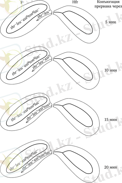 Сур. 2. Тоқтатылған конъюгация экспериментінде HFR хромосомасының берілу полярлығын суреттейтін Схема F жасушалары хромосомасымен рекомбинацияға тек HFR хромосомасының гендері қабілетті, олар конъюгация тоқтаған кезде реципиент F жасушасына айналды (Ф. Аяла, Дж. Крегеру, 1987)