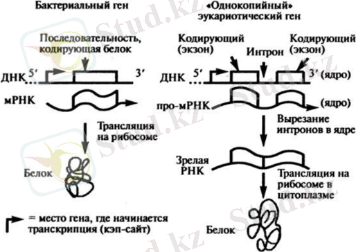 Сур. 3. Бактериалды емес геннің және апиын эукариоттық геннің бір реттік құрылымы