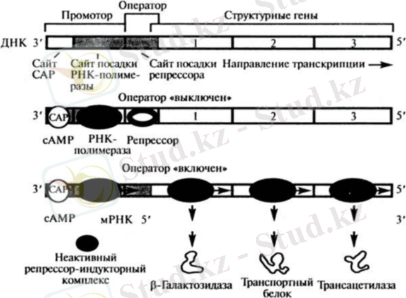 Сур. 3. E. coli бактериясында лактозаны жоюды реттейтін гендердің транскрипциясы