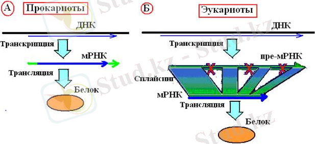 Эукариоттардағы гендердің молекулалық құрылымы прокариоттарға қарағанда әлдеқайда күрделі болды. Әдетте, эукариоттық гендердің ұзындығы прокариоттық гендерге қарағанда әлдеқайда көп. Сонымен бірге, әр ген белгілі бір жасушалық өнімдердің (ақуыздар, әртүрлі РНҚ және т. б. ) синтезін кодтайтын ДНҚ бөлімдерінен және генетикалық ақпаратты алып жүрмейтін, бірақ кодтау бөлімдерін бөлетін ДНҚ бөлімдерінен тұратындығы анықталды. Бірінші учаскелер экзондар, ал екінші бөлімдер интрондар деп аталды. Экзондар мен нитрондардың саны әр ген үшін жеке болады. Экзондардың ұзындығы интрондарға қарағанда қысқа. Құрылымдық гендердің бұл құрылымы мРНҚ синтезі процесінің ерекшелігін, сондай-ақ прокариоттар мен эукариоттардағы осы процестің айырмашылығын анықтайды. (Сур. 3. )