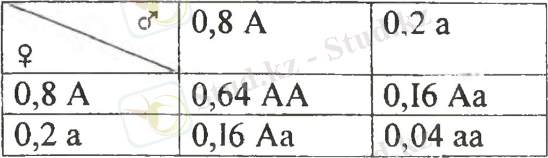 Сөйтіп әр жүз өсімдіктің 96-сы түкті (64-і гомозигота 32-сі гетерозигота), тек 4-уі ғана түксіз болып шығады. Бұл жағдайда келесі буындарда да «а» аллелі бар гаметалардың мөлшері 0, 2 (0, 04-гомозигота ш-дан, 0, 16-гетерозигота Аа-дан келеді) . Ал «А» аллелі бар гаметалардың мөлшері 0, 8 болады (0, 64 гомозигота АА-дан, 0, 16 гетерозигота Аа-дан) . Сөйтіп, бұл популяцияда да бірнеше буын бойы гендердің белгілі бір ара қатынасы, яғни 0, 8:0, 2 сақталады.