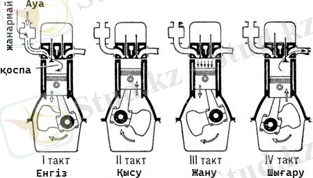 - Бірінші такт - поршень төмен қарай қозғалғанда отын қоспасын тартады. Бұл жағдайда қабылдау клапаны ашық болады.